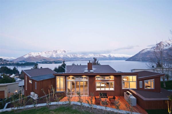 A modern Aspen Lodge overlooking the lake and mountains in Queenstown, New Zealand
