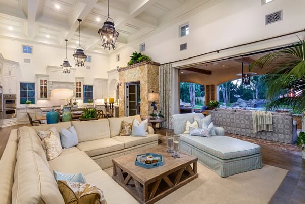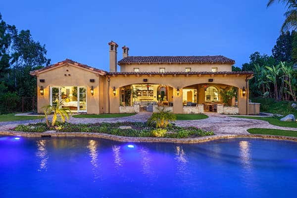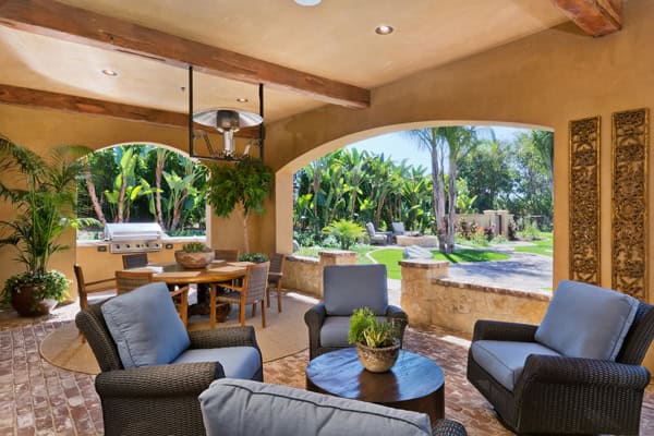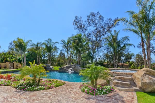 Ultimate NEW CUSTOM Construction 2014! Built by master builder Richard Doan. Perfect one-level floor plan with every possible custom detail and a focus on seamless indoor/outdoor living (800s.f. outdoor living room not included in square footage) – 1.1 elevated acres of privacy & new engineered lawn that requires half the water as standard grass. Smart Home installed w/integrated music, one touch lighting, temp control, 4 plasma tvs. With 4 spacious bedroom suites plus office, 4 car garage, the money was spent in the details and you will be wowed! New engineered lawn that requires half the water of standard grass. Designed by Mark Radford and furnishings by Susan Spath – no luxury or detail was overlooked. Four oversized bedroom suites, wire-brushed French Oak wood floors, executive office w/gorgeous custom built-ins & plasma TV. Walk in wet bar w/comfortable pull up slab stone counter and refrigerator wine unit, ice maker and hammered silver sink. Generous 4 car garage & separate storage area plus first class built-ins. Antique brick hardscape throughout backyard with lush landscape and landscape lighting – it is truly an Entertainers Dream! 800 square foot outdoor living room complete with heat lamps, flat screen TV, cooking area, lounge and eating area. Resort pool and spa w/3 water features, fire pit, and westerly views and breezes.