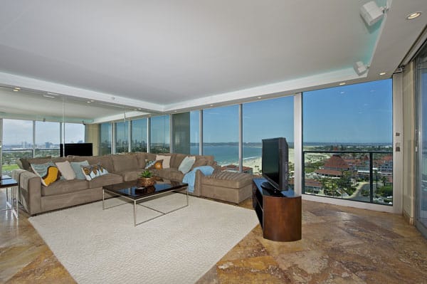 Marble tiles, Penthouse at The Shores, Coronado. Represented by Olga Minvielle Stevens & Olga Lavalle, Willis Allen Real Estate. Page 73, August Issue.