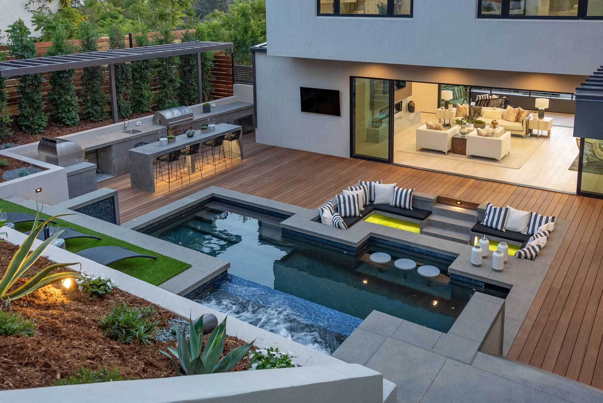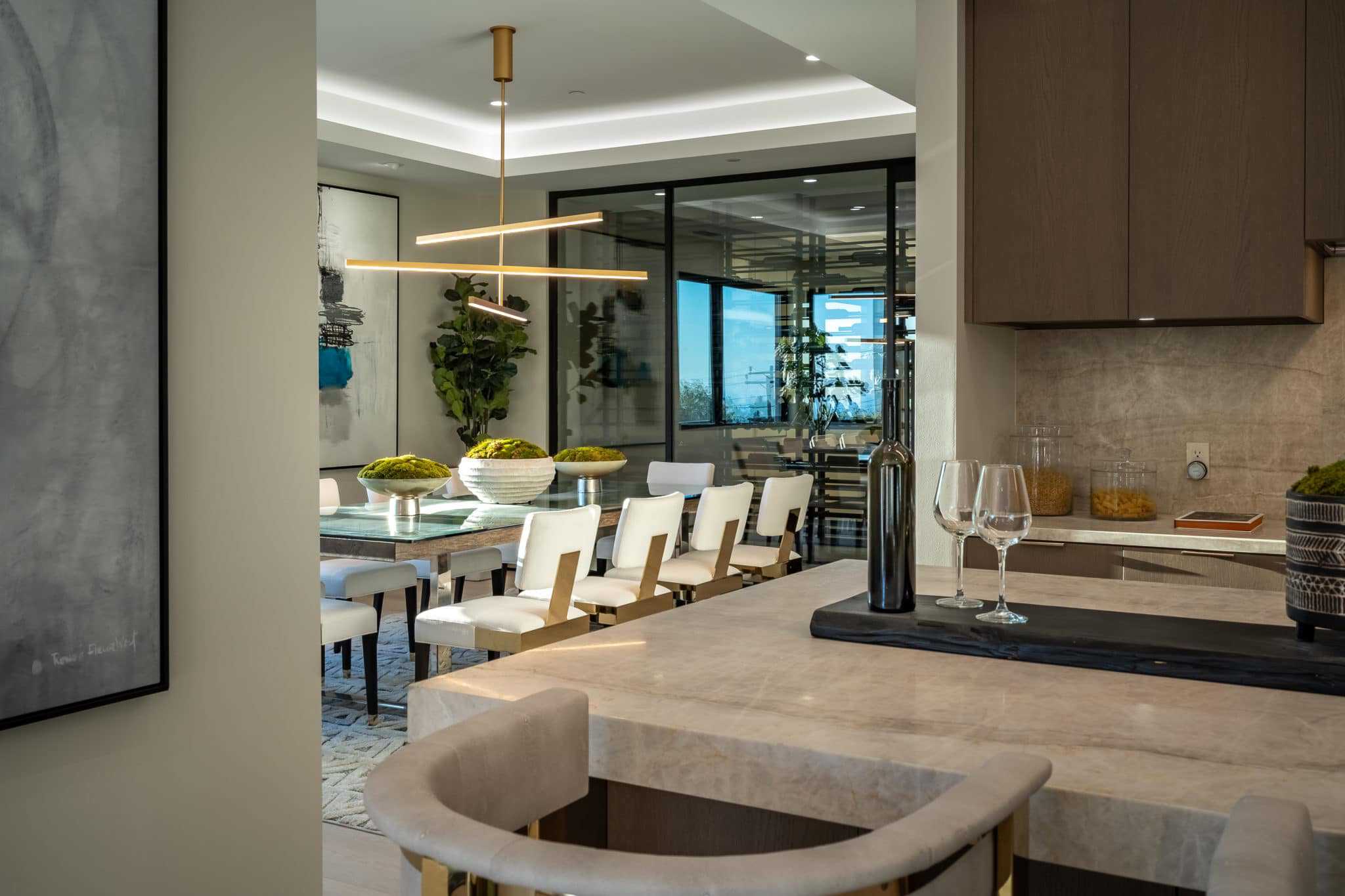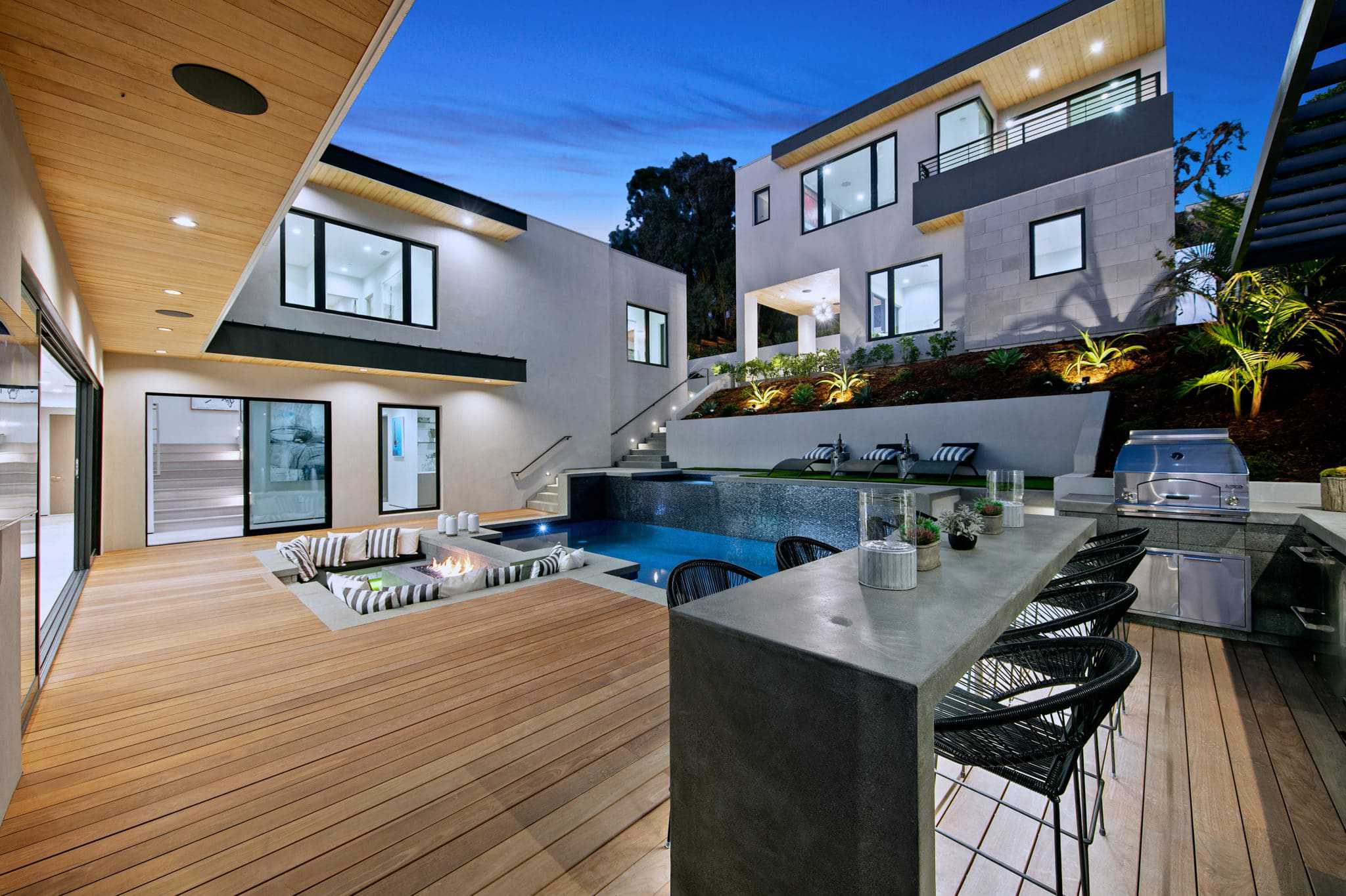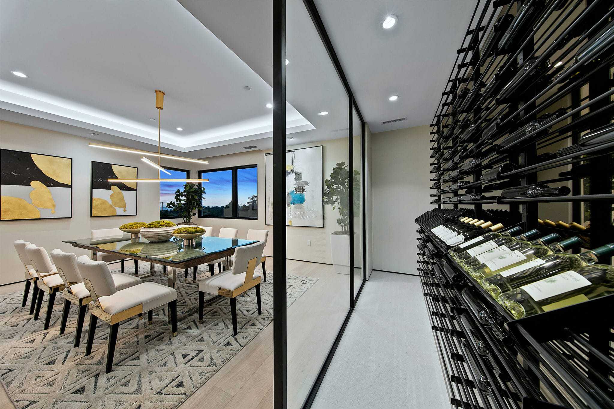 This modern sophisticated estate accentuates many aspects of mid-century design while incorporating new modern timeless elements and materials! Located on roughly a half-acre, Pelican Development delivers a “New Build” uncompromised elevated architectural masterpiece! Upon entering through the private gates, you are welcomed by a large motor court and an oversized dramatic custom stone entry. Main level living incorporates a great room with open concept living, modern kitchen elements, dining room, wine cellar, and 24’ walls of glass for a unique indoor/outdoor experience. Enjoy the many outdoor entertaining spaces and endless amenities including pool, spa, sunken fire pit, putting green, and outdoor kitchen, all while taking in the ocean views. The primary suite on the second level enjoys views of serene treetops, coastline, and ocean views, and includes an oversized closet, his/her spa bathroom, and private outdoor patio. A large and private two-story casita with a home office is located across from main house overlooking the pool and interior courtyard. Every inch of this property was designed and used to maximize its beauty and overall function!