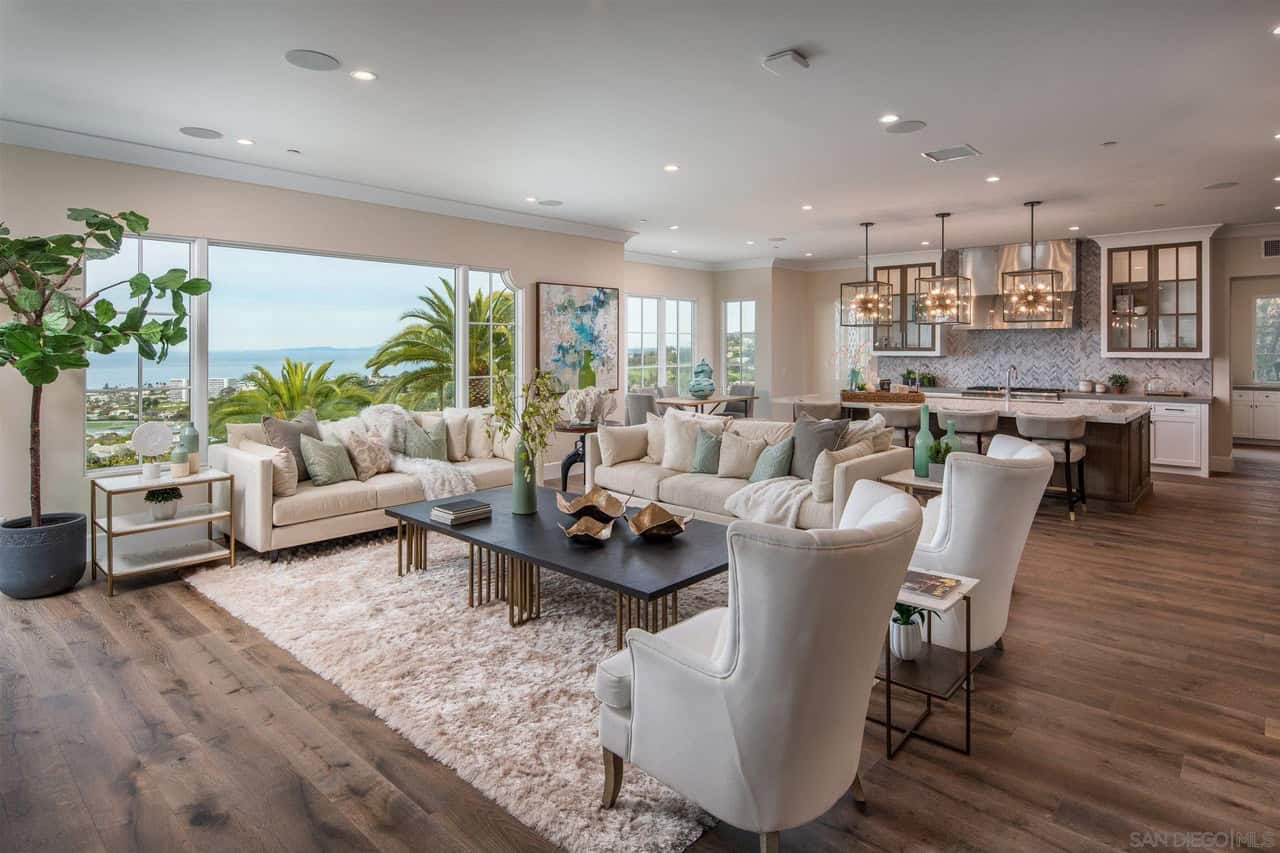 Brand new construction on Muirlands Drive completed in 2021 features timeless architecture on over half an acre with panoramic ocean, village, and golf course views from nearly every point of the property. Three stunning levels center on a striking entry floor where a great room with kitchen, living, and dining opens to a view terrace warmed by an outdoor fireplace. Property has seven en-suite bedrooms including a dedicated guest suite, executive office, wellness center with dry and steam saunas, saltwater pool and spa, media room with bar and wine storage, elevator, Control4 tech, three-car garage, and gated motor court for exceptional off-street parking.