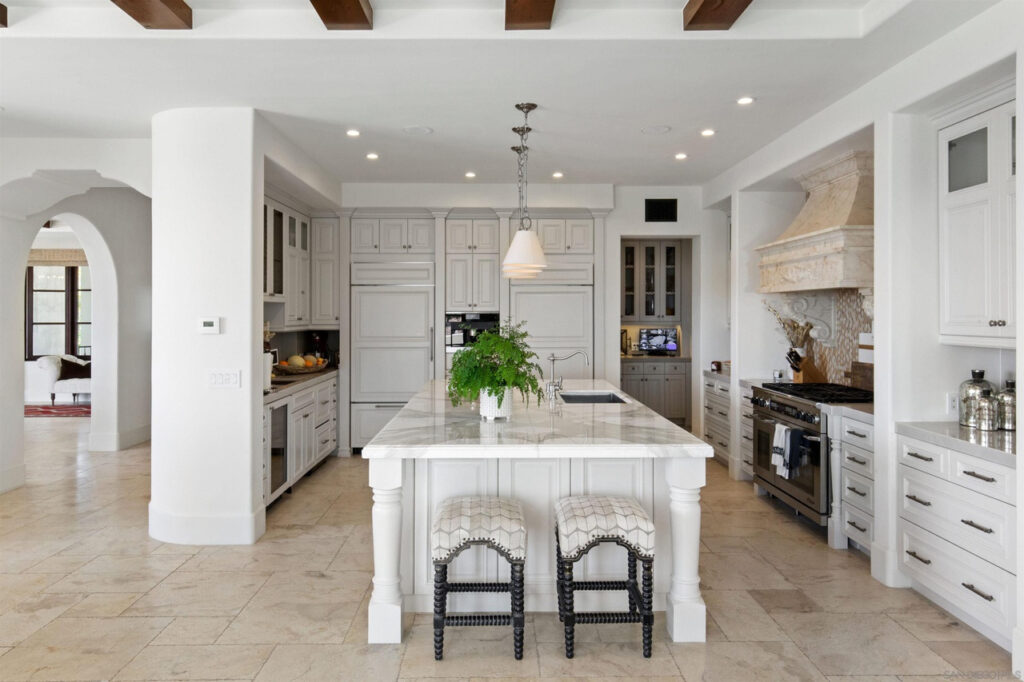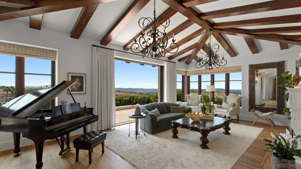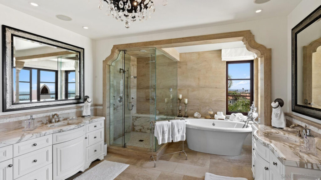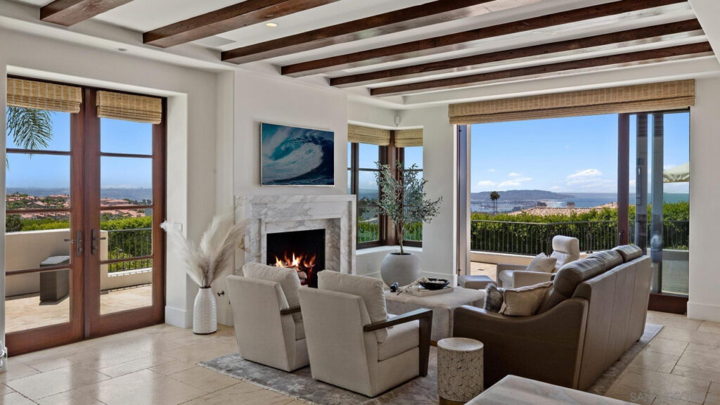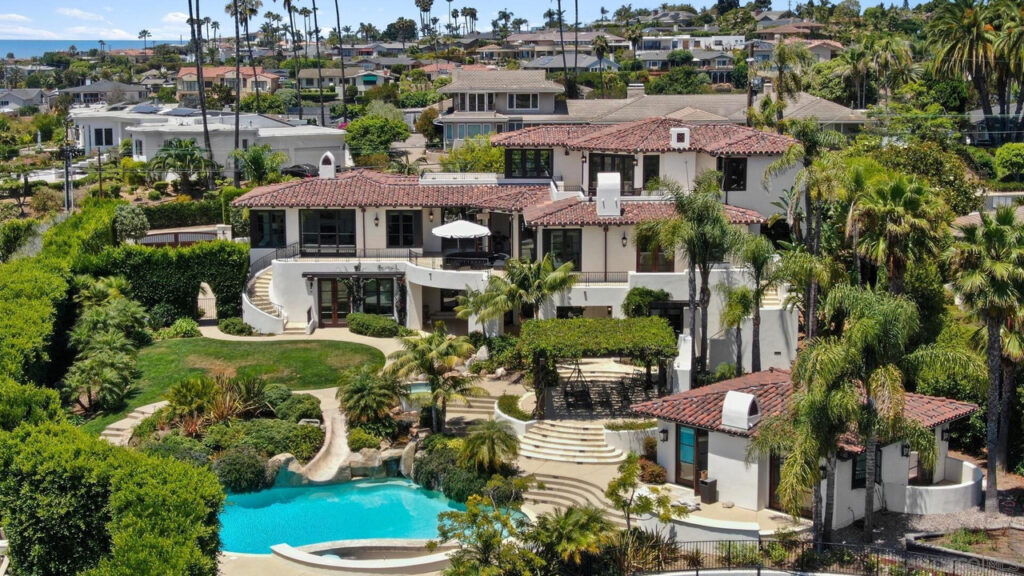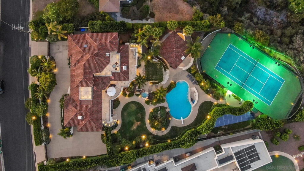 Set on nearly one acre of land and with captivating panoramic views of the ocean, bay, and city skyline, this Mediterranean-chic estate radiates elegance. The fully-gated property offers exquisite architecture while expansive view terraces capture the horizon from sunrise to sunset. A recent top-to-bottom refresh includes a remodeled kitchen, new French doors, new carpeting, refinished wood floors, resurfaced tennis court, and more. The sprawling estate also features a guest house, wine room, six-car garage, home theater, luxurious paneled library/office, and stunning resort-style pool with swim-up bar and water slide. As an added bonus, this exceptional residence is powered almost entirely by solar.
