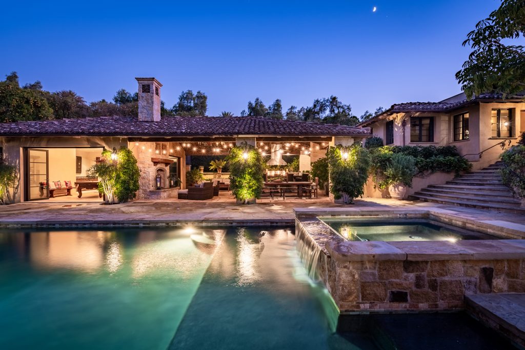 Noble hilltop estate brimming with sophistication. Unspoiled dramatic views from the Great room that extends into an expansive balcony, an open-air dining room and a private veranda off the main bedroom. Attuned to the needs of contemporary life is a family-focused kitchen, main suite with a relaxing retreat and dual en suites. Second main suite with private view balcony and detached Casita with two adjacent guest parking spaces. The deluxe pool pavilion/pool house echoes the same level of luxury. Main home 6615 SF, guest house 837 SF, with 672 SF pool house. Your own private destination resort. This idyllic property is expansive and calming with a romantic tone of a European estate. Once in a lifetime opportunity … La Bella Vita!