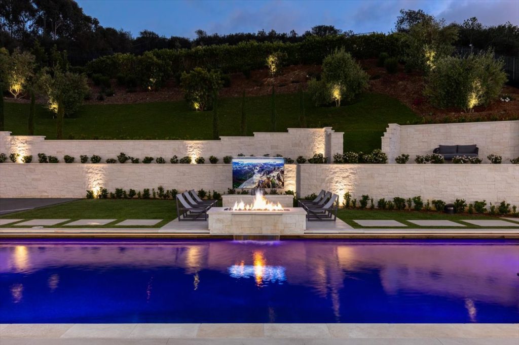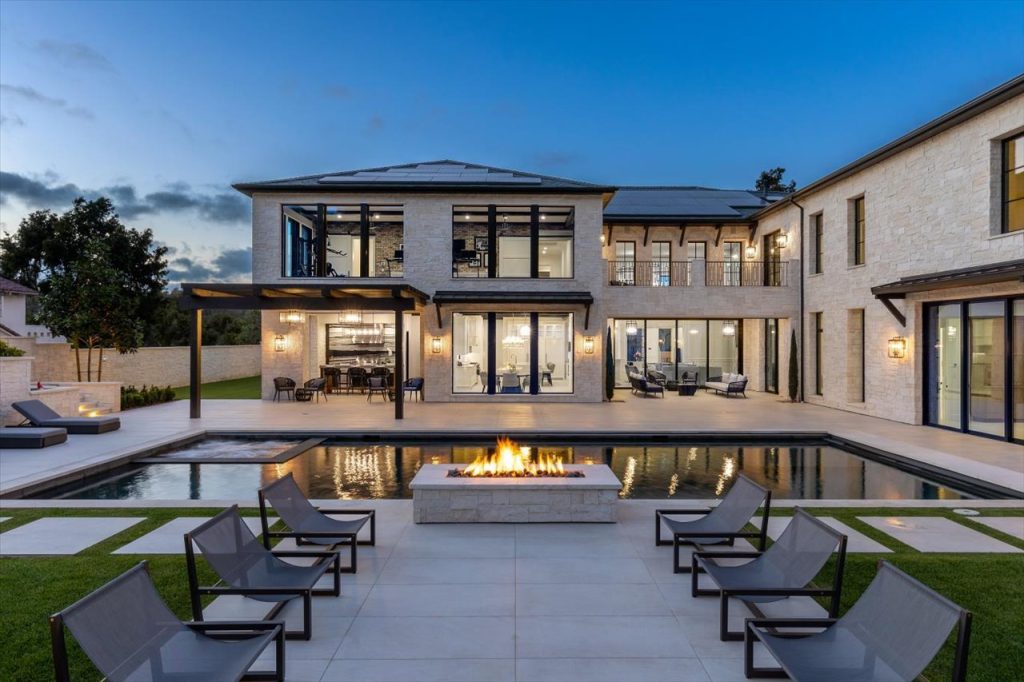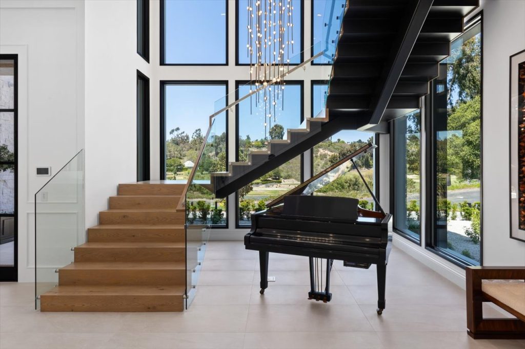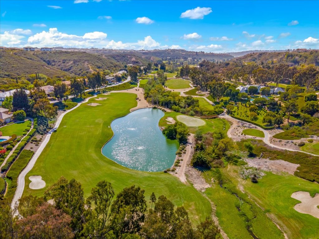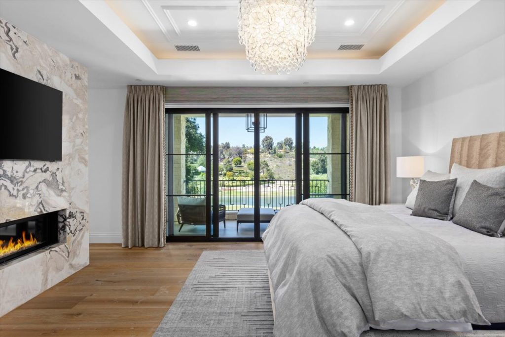 Impeccable design & scale take center stage in this 2022-built modern estate. Bespoke designer finishes throughout include a floating foyer staircase with adjacent custom walnut elevator, large format Italian & European white oak floors, floor-to-ceiling glass wine storage, exotic backlit onyx bar, basalt stone waterline pool/spa that gives a glass-top effect, 5-star resort-style gym & wellness center, and sliding doors creating a seamless confluence from inside-out. With second floor sound proofing, the ultimate primary suite offers total privacy and unobstructed views, complete with a spa destination bath, two custom boutique closets, and an open relaxation area. The incomparable quality throughout extends to the slate roof with owned solar, 5-car garage, outdoor entertaining with retractable TV and poolside firepit, and aesthetic sport court. Situated on over 1 acre in a premier gated community, the property overlooks one of Rancho Santa Fe’s finest golf courses.