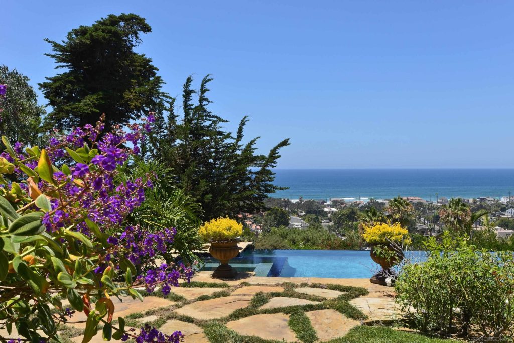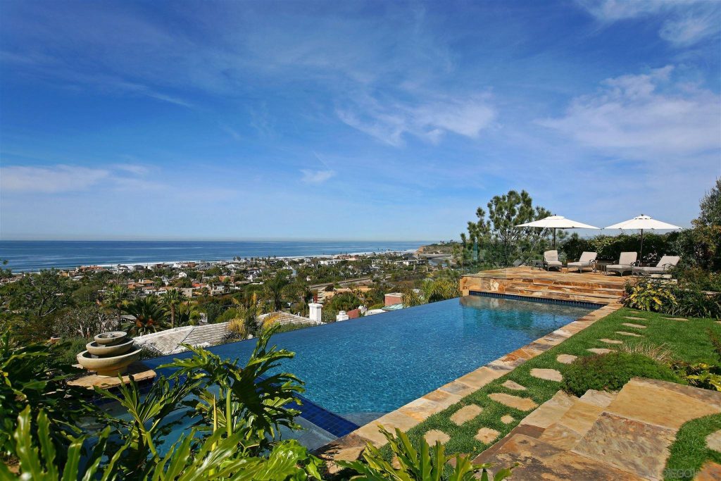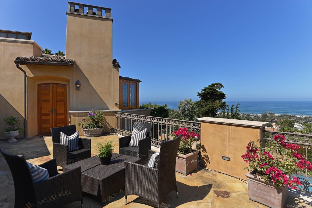 This extraordinary seaside Villa represents a tremendous value in Olde Del Mar comprised of a sizeable gated residence on an impressive 15,000 sq. ft. parcel, a generous yard with a pool and spa, and awe-inspiring views spanning across the Pacific Ocean to the Del Mar racetrack. This floor plan is a unique opportunity for flexible living spaces and extensive options for its occupants. The main house is ideal for couples, singles or a small family which includes the ocean view master suite with 1,000 sq. ft. view loggia, dual walk-in closets, and a romantic bath. In addition, there is an en suite bedroom plus a 2-story den/office. Outside the main house, and within the loggia, you will find another ocean view bedroom suite (continued). plus an ocean view office/music room (optimized for sound isolation), as well as a separate ocean view en suite bedroom below the pool deck – perfect for guests or kids coming back home! The kitchen is a cook’s dream with custom cabinetry in solid Honduran mahogany, Brazilian granite counter tops, stainless steel appliances, a butler’s pantry, and floor-to-ceiling paneled glass doors that open onto a spacious Cameroon flagstone deck. Enjoy a 2,400 bottle climate-controlled wine room, 4 fireplaces, Venetian plaster walls, imported marble and mahogany wood flooring. The breathtaking yard is surrounded by gracious patios with mature landscaping, a large grassy area, a fire pit, built-in barbecue, vanishing edge pool and spa. Other notable highlights: 3-level security & monitoring system, computer-controlled radiant floor heating throughout, 3 zones of central forced A/C, built-in music system with independent stations, distinctive ceiling designs including custom Venetian plaster ceiling vaults, reclaimed wood beam ceilings, custom-designed solid Honduran mahogany doors, windows & shutters, custom light fixtures, smart wiring, and much more!