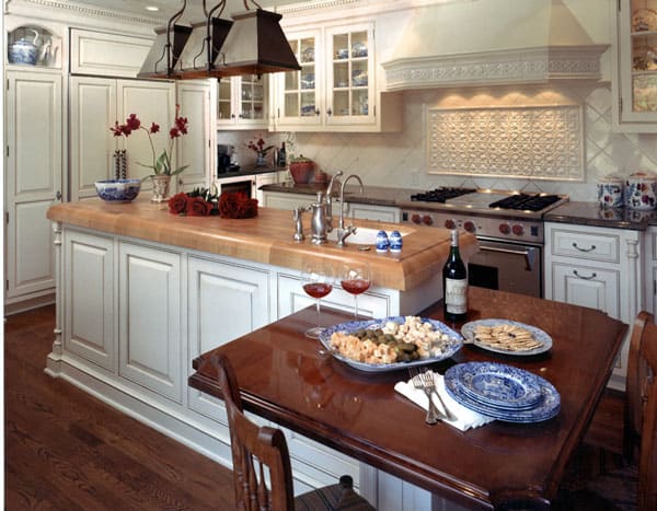 Dual-level countertop features thick Maple butcher block island workspace paired with lower seating at a Mahogany table. The perfect combination of casual and formal.