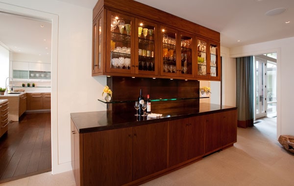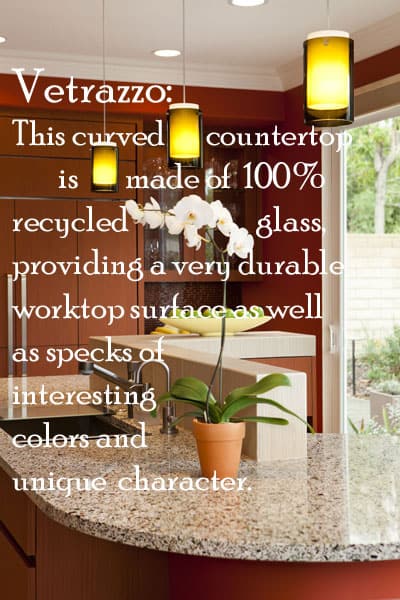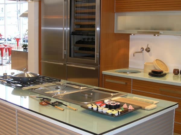 Glass is a unique material providing an attractive transparency over any surface, while maintaining durability and flexibility. The perimeter countertops are made of Pyrolave, an enameled glazed volcanic lava stone, available in 32 colors as well as custom.
