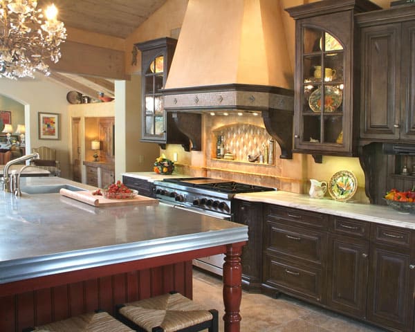 This pewter-topped island is a distinctive material choice bringing to mind bistro bar tops from Paris. Patina was added to the finish by throwing acid-soaked sawdust to replicate pitting & aging.