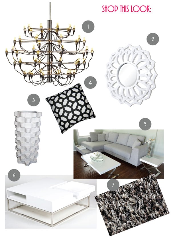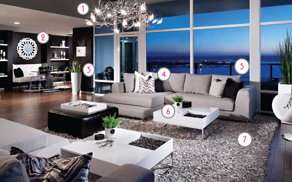 Decked out by interior designers Ariana and Kira of Design Squared Interiors, this fashionable penthouse in Sapphire Tower is swanky-chic with a bold high-contrast black and white palette. Bring the “Urban Sophisticate” look home with these finds…