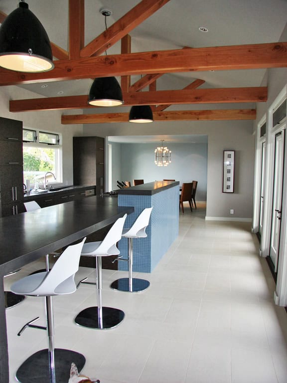 but at a considerable cost savings. We prefer 12” x 36” tiles with no grout lines and stainless steel transition strips to finish edges or as a decorative linear accent.
