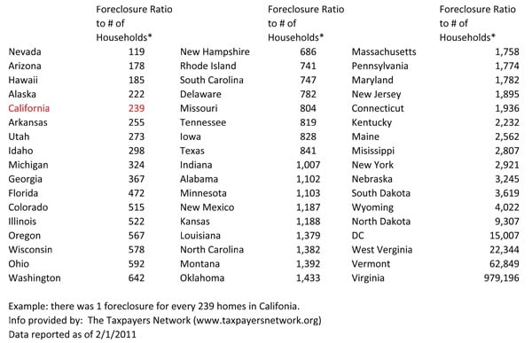 According to RealtyTrac.com (9/21/11) 1 in every 226 housing units in California is in Foreclosure.