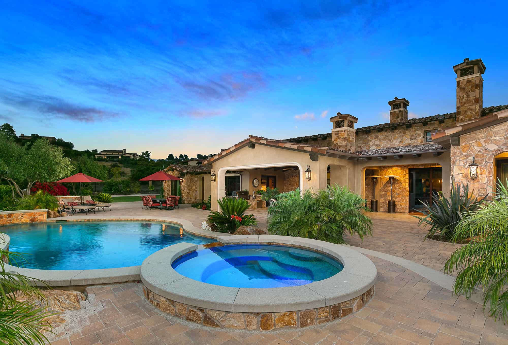 “This custom new construction in Fairbanks Ranch was the finest example of CA living with its infinity edge pool and spa, bbq dining, recessed fire pit, and ample patio.” Lucy Kelts