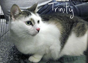 Trinity lost her longtime home when her guardians had two kids and no time for her. She is an even-keeled and low-key kitty who likes to be around her humans; you will more than likely find her in whatever room you settle in. While she is not a demanding cat, when she is offered attention Trinity is over the moon with joy: she will cuddle on your lap or against your side, fire up her loud purr and roll around while you scratch her. She is so sweet and adorable and just can’t get enough of your love and affection.