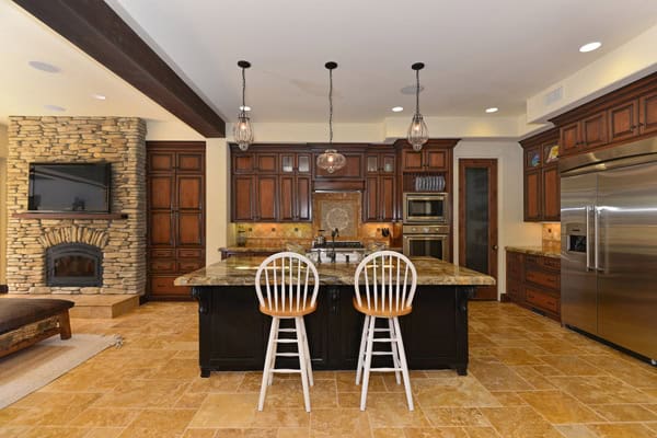 Indoors the spacious floorplan is both effortless and elegant, executed to make the traditional style feel completely fresh and modern. Every surface from the stunning wood and stone flooring, beamed ceiling, stone fireplaces, counter tops, and custom cabinetry was scrupulously chosen for quality and craftsmanship.