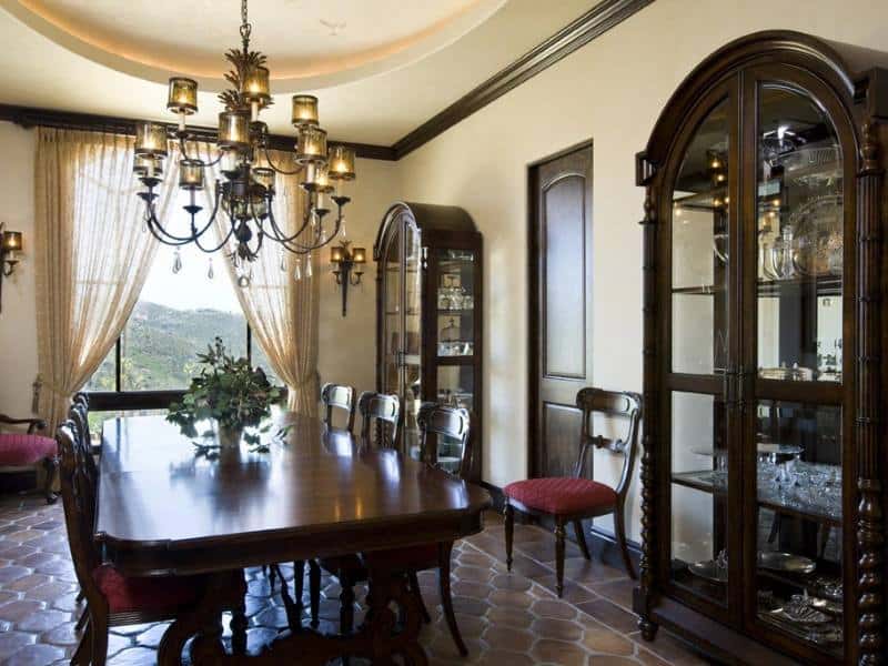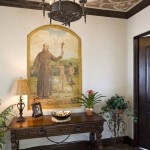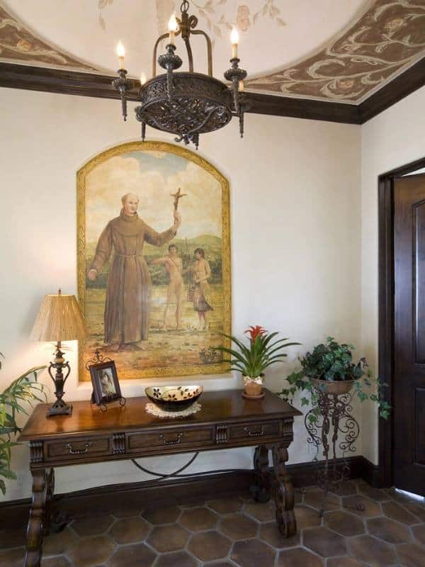 The exquisite details found even in the hallways are representative of the care and meticulous design choices made by Dodds in every room. An arched recess provides the perfect canvas for a mission inspired Junipero Serra scene painted by San Diego artist Edmond Piffard. He also painted the floral motif found in the spaces ceiling dome, one of 6 detailed ceilings found in the home. Lighting the dome in rustic style is a Savoy House bronze chandelier with cream candle covers completing the mission ambiance.