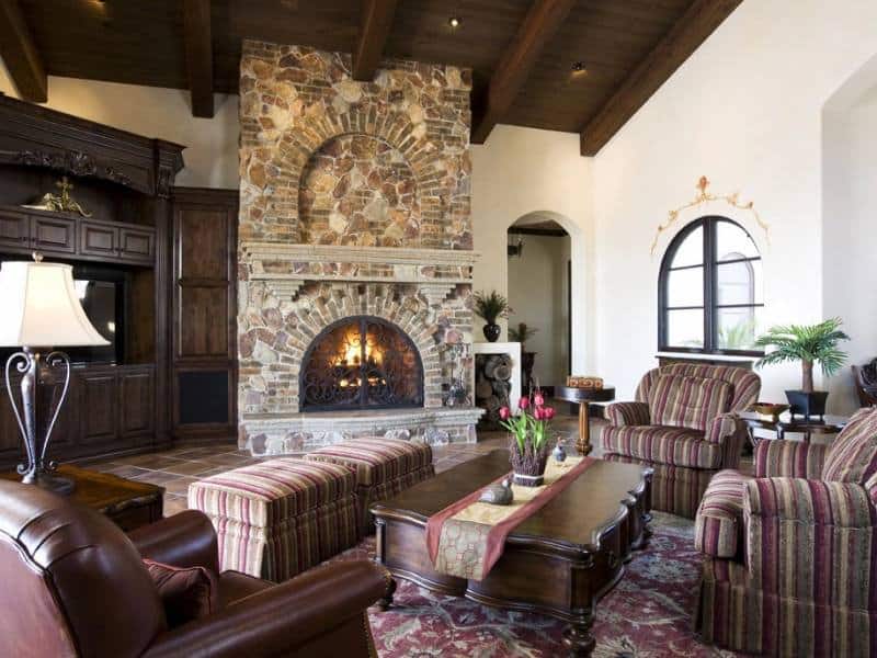 The centerpiece of the room and the heart of the home is the magnificent fireplace. A Robert Dodds concept he says, “I knew I wanted to use a combination of old brick and stone with full radius arches, creating a one-of-a-kind but authentic reflection of the Mission style. I talked it over with Martha and Dick and they loved the idea and added their own thoughts. We then brought the concept to J A Williams Masonry and his embellishments completed the vision.” Using Indian Rubble and Telluride Gold Stone with Glen Gary bricks handmade by a father and son in Atlanta for the façade and tripled up Cameron Flagstone on the mantle and hearth, the final product is unique and majestic. A custom iron fireplace screen offered the finishing touch.