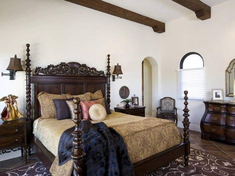 The master bedroom combines the best of classic mission style with the updated comforts of today. All walls have a smooth hand-textured finish by Jeff Walker Drywall. Corbels finish the exposed ceiling beams all the way through the bedroom to the cozy sitting area. A perfect spot for relaxing with a book or watching movies, the centerpiece of the sitting area is the fireplace with wood mantle and custom surround by Encinitas Tile. A nook for fire wood storage next to the fireplace is a charming touch.