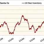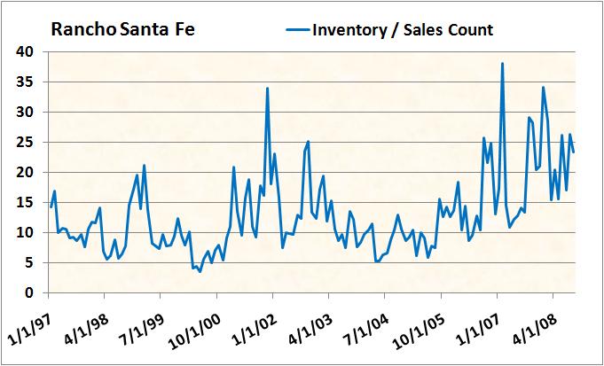 This is not the case for number of properties sold. Declines there have created significantly new lows. When we take historical inventory levels and divide them by the number of properties sold, we get supply-over-demand, as shown in Chart E. Here we see the same pattern exhibited in Rancho Santa Fe. The ratio has been steadily rising ever since 2005, creating new highs. At the beginning of that period, we see for every