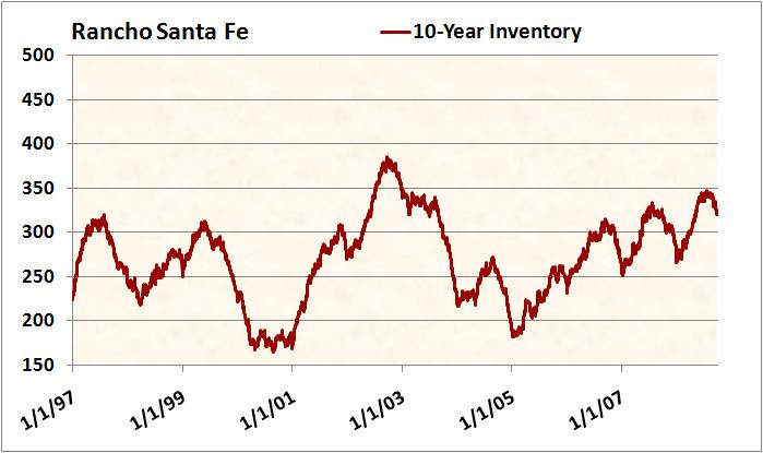 To create this historical supply/demand trend, we calculated Del Mar’s historical inventory from January 1997 – October 2008 (Chart D). Like Rancho Santa Fe, average daily inventory began climbing in the