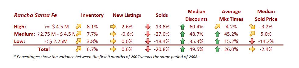 This apparent paradox is exhibited in Chart C which provides year-over-year variances for many Rancho Santa Fe parameters comparing the first 9 months of 2007 to the same period of 2008. As exhibited within the 10-year inventory chart, supply has been increasing over the last two years, but sales have been decreasing faster than supply has been growing, resulting in an upward trending supply/demand ratio