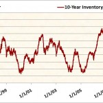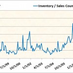 However, as we all know, supply is only half the picture. When we take the average inventory and divide it by the number of properties sold we get Chart B. This shows how the supply/demand ratio has trended over the last 10 years. Essentially, this chart represents the history of how many properties were available for sale per property sold. This ratio has trended flat, for the most part, with some volatility. Except starting in 2005,