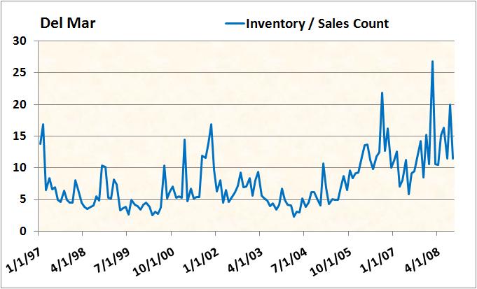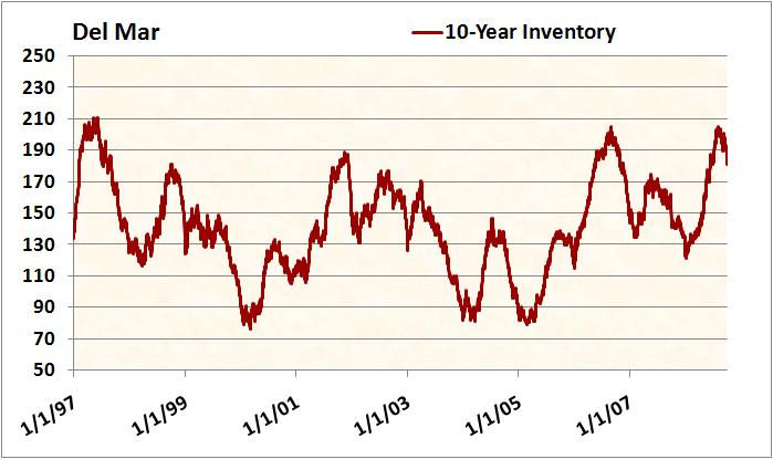 beginning of 2005. During that ascent there has been dips; nevertheless, the general path has been upwards, ever since. Twice inventory levels reached historical highs set back in 1997 (coincidentally, near San Diego’s last real estate bottom), approaching a daily average of 210 properties available for sale. However, since 2005, inventory levels have not broken out to set new historical inventory records. Yet, Del Mar does seem to be testing the 210 inventory mark.