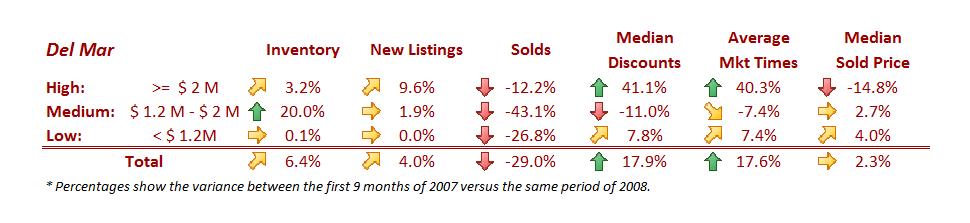 As we saw in Rancho Santa Fe, higher-end sellers can hold out for price longer than most, even under excess supply conditions. But also, like we mentioned for Rancho Santa Fe, that only works for so long, if supply continues to outstrip demand. For example, Del Mar’s high-end inventory, properties with an original listing price greater than $2 million, has nearly doubled from January 2008 to October 2008. So, despite sellers increasing their marketing times by 40% more than last year, median prices have declined more than any other price tier in Del Mar (Chart F). Consequently, while it is important to look at a community’s overall