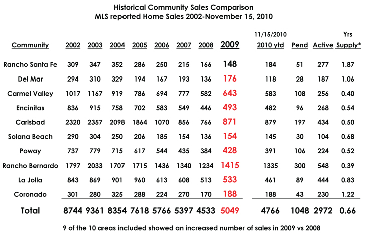 Sales Activity: Over the past month, the total number of closed sales in 2010 rose from 176 to 188, an increase of 12 closed sales. The number of homes in escrow as of November 15, 2010 remained virtually the same, 43 compared to 44 a month ago. When factoring in the 12 properties which closed escrow since September 15, 2010 there were 13 net new escrows reported opened this past month.