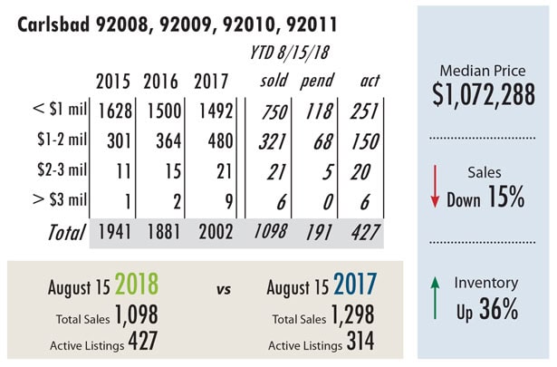 SEPTEMBER Issue Carlsbad total MLS reported sales, active listings, month’s inventory supply, and median sales price** compared to the same period last year.