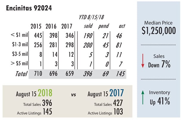 SEPTEMBER Issue Encinitas total MLS reported sales, active listings, month’s inventory supply, and median sales price** compared to the same period last year.