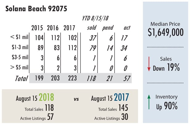 SEPTEMBER Issue Solana Beach total MLS reported sales, active listings, month’s inventory supply, and median sales price** compared to the same period last year.