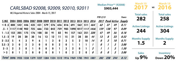 APRIL Issue Carlsbad total MLS reported sales, active listings, month’s inventory supply, and median sales price** compared to the same period last year.