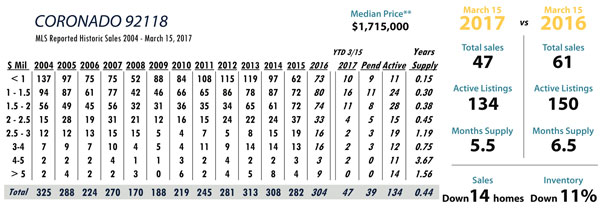 APRIL Issue Coronado total MLS reported sales, active listings, month’s inventory supply, and median sales price** compared to the same period last year.