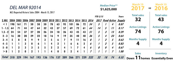 APRIL Issue Del Mar total MLS reported sales, active listings, month’s inventory supply, and median sales price** compared to the same period last year.
