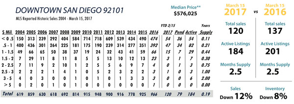 APRIL Issue Downtown San Diego total MLS reported sales, active listings, month’s inventory supply, and median sales price** compared to the same period last year.