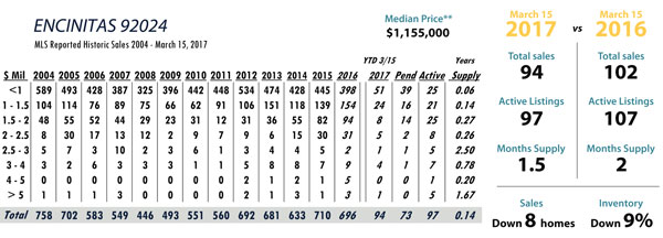 APRIL Issue Encinitas total MLS reported sales, active listings, month’s inventory supply, and median sales price** compared to the same period last year.