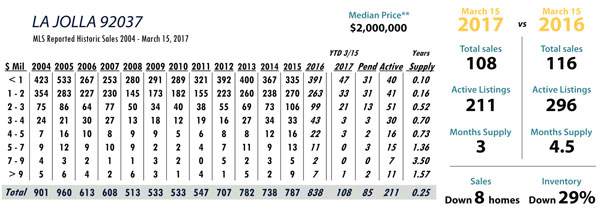 APRIL Issue La Jolla total MLS reported sales, active listings, month’s inventory supply, and median sales price** compared to the same period last year.