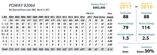 APRIL Issue Poway total MLS reported sales, active listings, month’s inventory supply, and median sales price** compared to the same period last year.