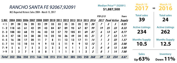 APRIL Issue Rancho Santa Fe total MLS reported sales, active listings, month’s inventory supply, and median sales price** compared to the same period last year.
