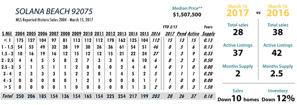 APRIL Issue Solana Beach total MLS reported sales, active listings, month’s inventory supply, and median sales price** compared to the same period last year.