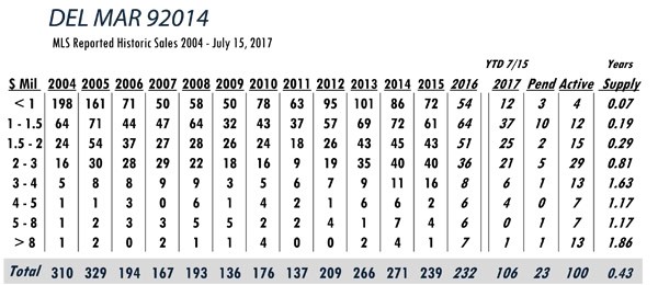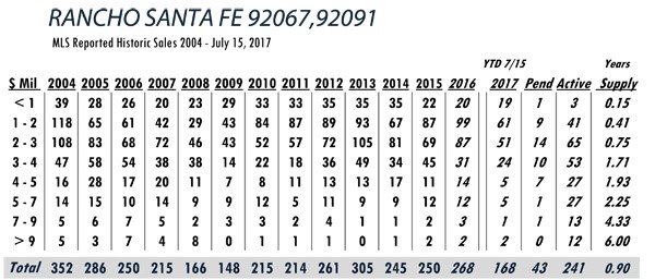 Breakdown of MLS reported sales for 11 luxury areas analyzed by price points with year supply estimates. This detailed information provides important indicators for pricing and marketing strategies for buyers and sellers. Rancho Santa Fe, Del Mar, La Jolla, Carmel Valley, Carlsbad, Coronado, Encinitas, Solana Beach, Poway, Downtown San Diego and Rancho Bernardo/Santaluz/4S Ranch.