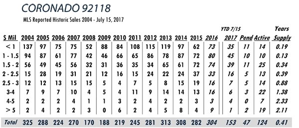 AUGUST Issue Coronado total MLS reported sales, active listings, month’s inventory supply, and median sales price** compared to the same period last year.