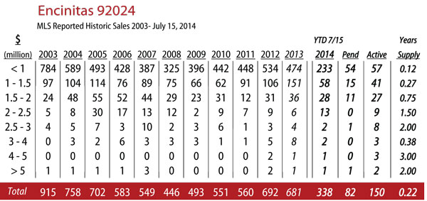 Click here for Encinitas historical sales compared by price range 2003-2013 < $1 million, $1 – $2 million, > $2 million