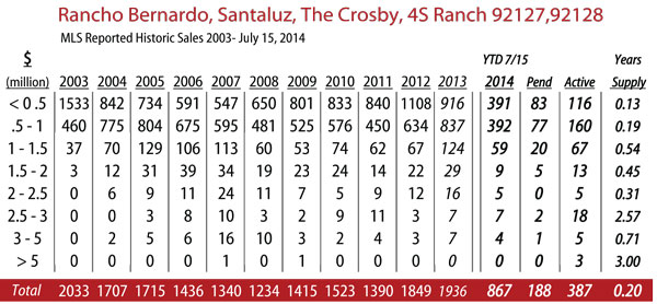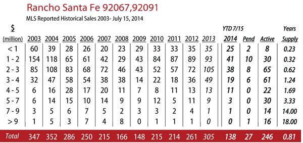 Click here for Rancho Santa Fe historical sales compared by price range 2003- 2013 < $1 million, $1 – $3 million, $3 – $5 million, > $5 million