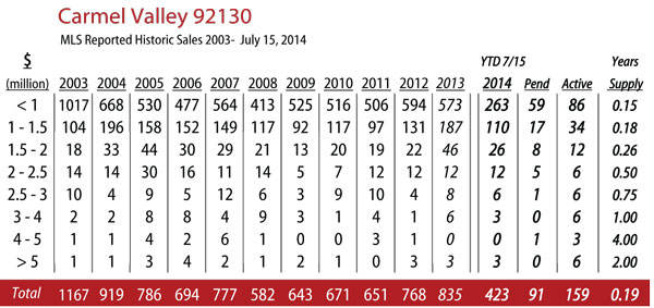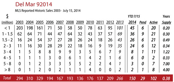 Click here for Del Mar historical sales compared by price range 2003- 2013 < $1 million, $1 – $2 million, > $2 million