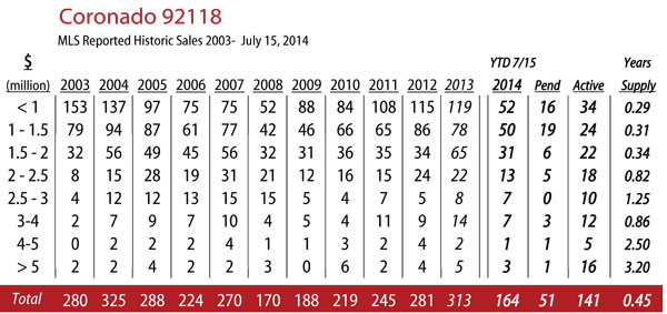 Click here for Coronado historical sales compared by price range < $1 million, $1 – $2 million, > $2 million