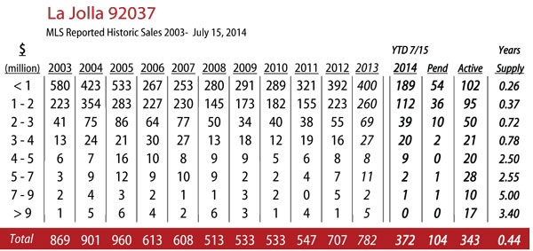 Click here for La Jolla historical sales compared by price range < $1 million, $1 – $3 million, > $3 million
