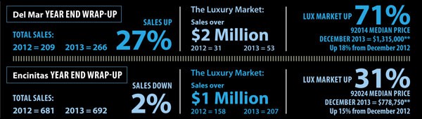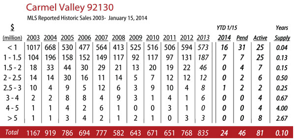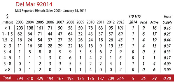 Click here for Del Mar  historical sales compared by price range 2003- 2013  < $1 million,  $1 – $2 million, > $2 million