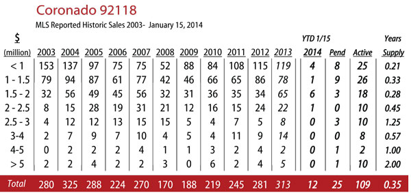 Click here for Coronado historical sales compared by price range < $1 million,  $1 – $2 million, > $2 million