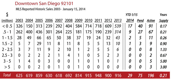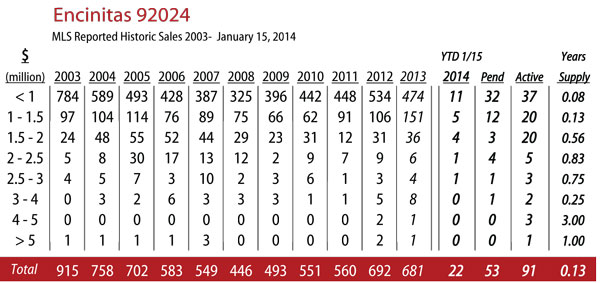 Click here for Encinitas historical sales compared by price range 2003-2013  < $1 million,  $1 – $2 million, > $2 million